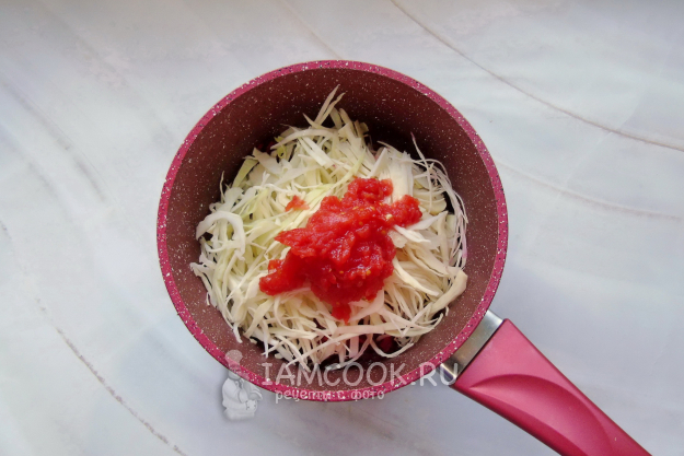 Капусту нарежьте тонкой соломкой. Помидоры измельчите любым способом. Выложите в кастрюлю.