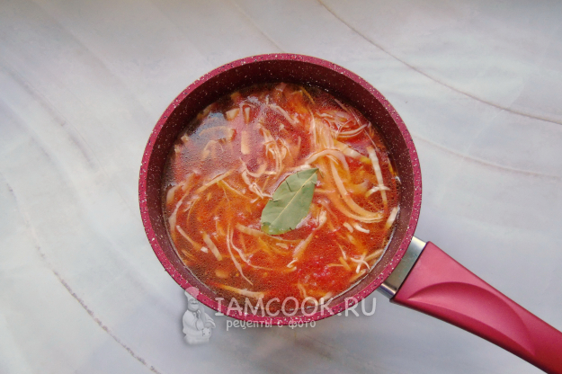 Налейте в кастрюлю бульон, посолите, поперчите по вкусу, выложите лавровый лист.