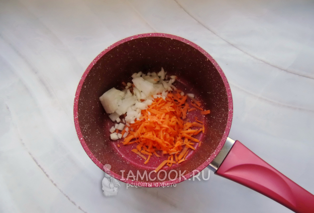 Морковь, лук очистите, помойте. Лук мелко нарежьте, а морковь натрите на терке. Выложите в сковороду или, как у меня, кастрюлю с толстым дном.