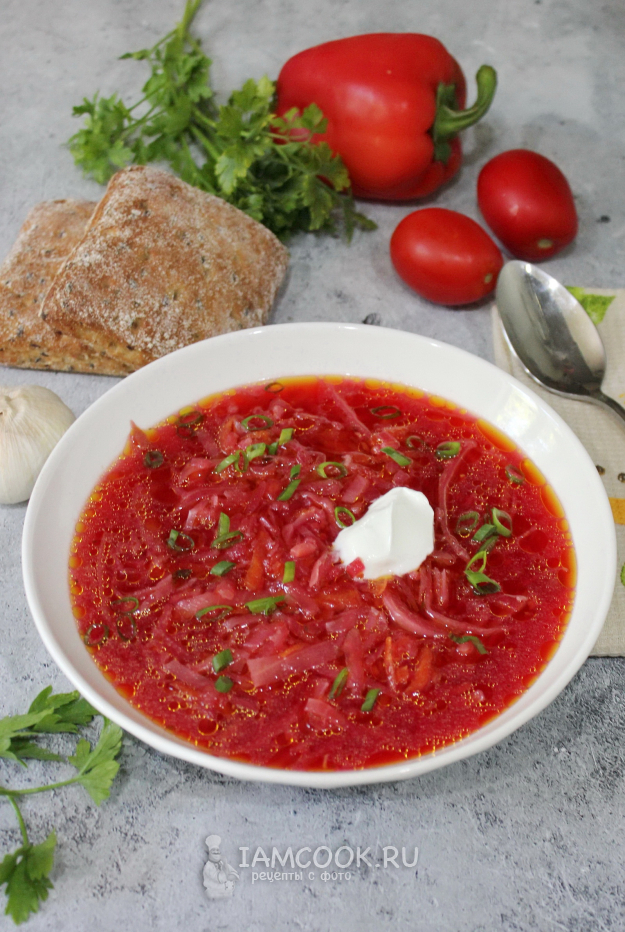 Борщ с рисом готов. Подавайте со сметаной.