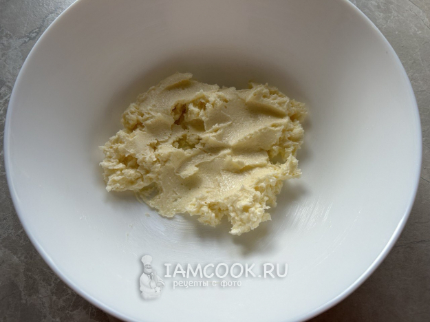 Перетереть мягкое сливочное масло с сахаром (55 г) и щепоткой соли.