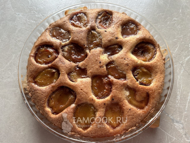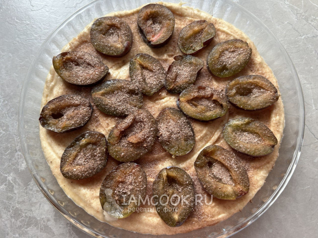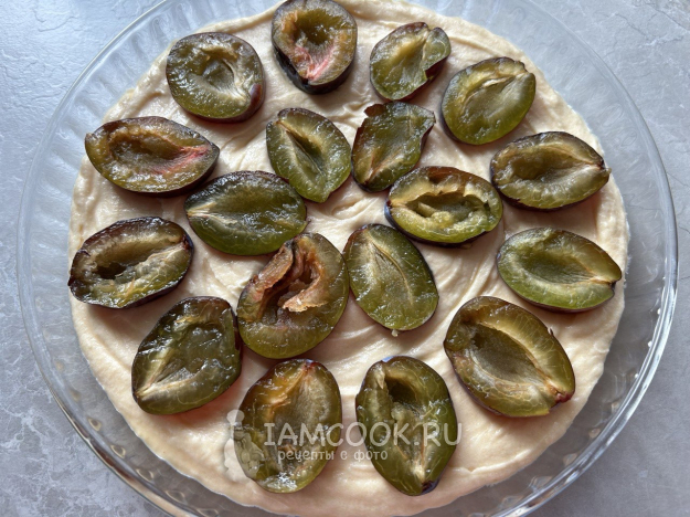 Выложить сливы на пирог разрезом вверх.