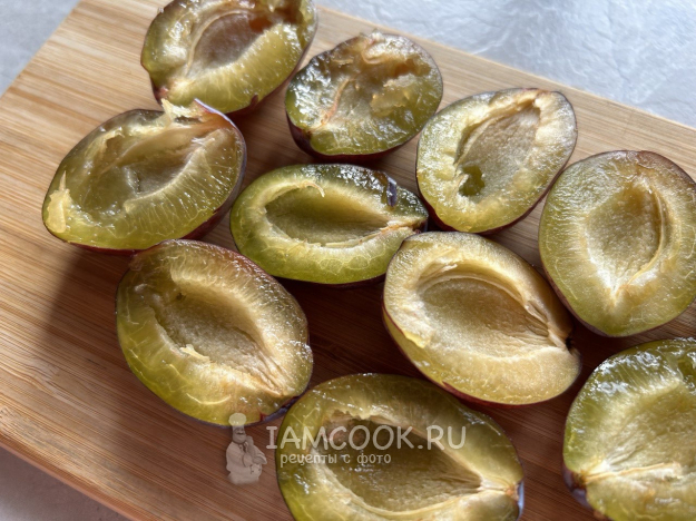 Разрезать сливы пополам и вынуть косточку.