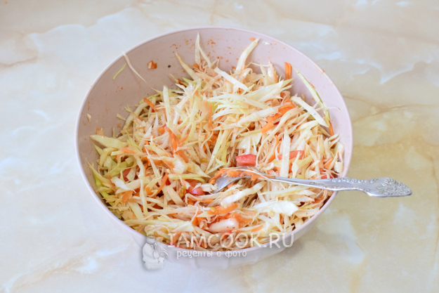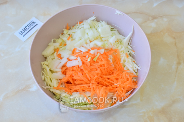 Переложите капусту в чашу. Мелко нарежьте лук и потрите на терке морковь. Добавьте к капусте.