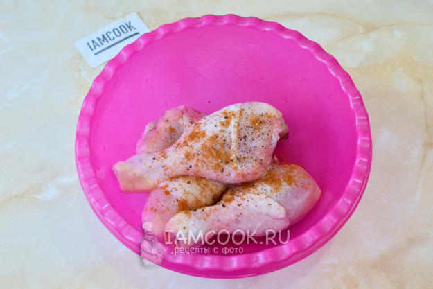 Курицу промойте в проточной воде и обсушите бумажными полотенцами. Вотрите в курицу соль и специи. Оставьте так постоять минут на 10-15.