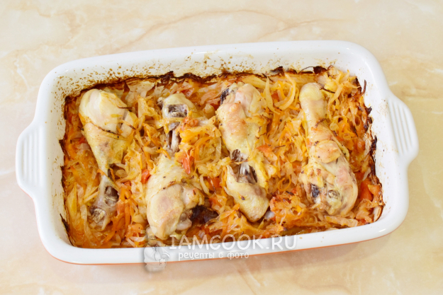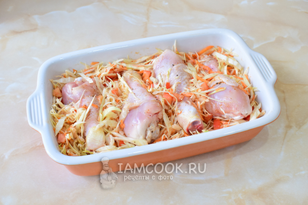 Для запекания отлично подойдет керамическая форма. Выложите в неё капусту и разложите курицу.