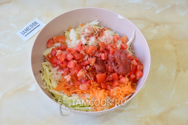Добавьте помидоры, нарезанные кубиками. По вкусу посолите и посыпьте специями. Выложите томатную пасту. Полейте растительным маслом.