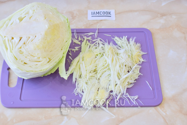 С капусты снимите верхние 2-4 листика. Затем капусту тонко нашинкуйте.