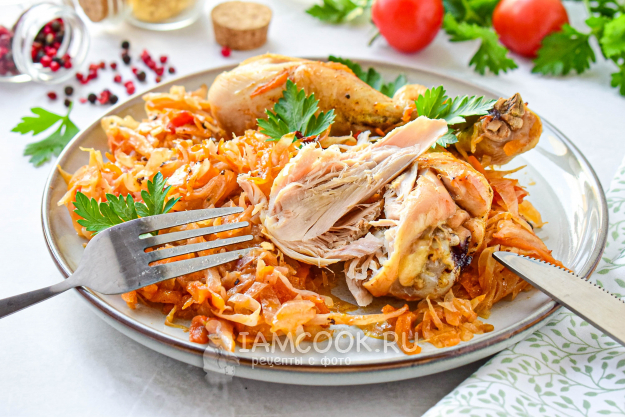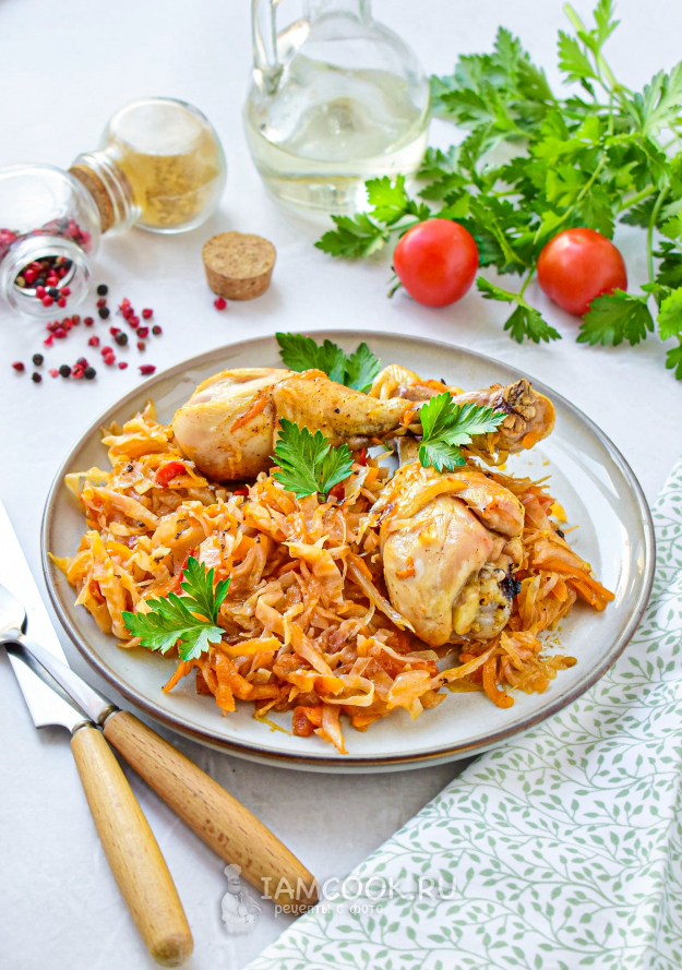 Закройте форму фольгой и подверните все края. Поставьте капусту с курицей в духовку, предварительно разогретую до 180 градусов, примерно на 50-60 минут. Затем снимите фольгу и оставьте еще на 5-7 минут. Сока от курицы и овощей будет достаточно для тушения. Но можно добавить и немного воды.