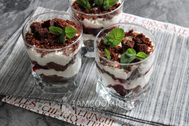 Слои порционных десертов: кусочки брауни, вишнёвый джем, творожный крем, кусочки брауни, вишнёвый джем, творожный крем, крошки от брауни.