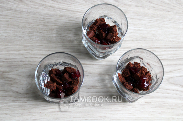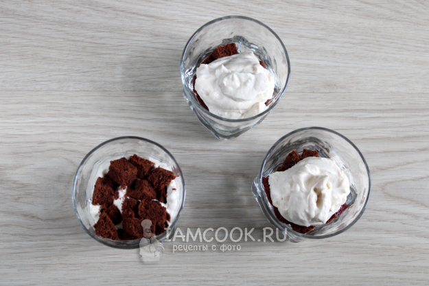 Консистенция крема не должна быть слишком густой, так он лучше пропитает кусочки брауни. Первая половина крема пойдет для одного трайфла (на два слоя), вторую половину крема нужно разметить на три стакана по два слоя в каждый.
