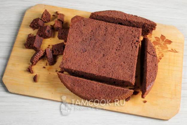 Для десерта остывший шоколадный корж нужно нарезать на кусочки. Из круглой заготовки предлагаю вырезать квадрат для небольшого трайфла и его затем нужно разрезать на две части. А четыре полученных скруглённых обрезка нарежьте кубиками.