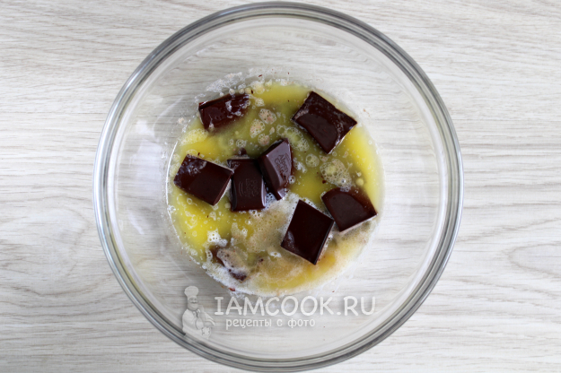 Чтобы приготовить тесто для брауни, растопите сливочное масло на плите в кастрюльке или в миске в микроволновке и расплавьте в нём кусочки темного или горького шоколада.