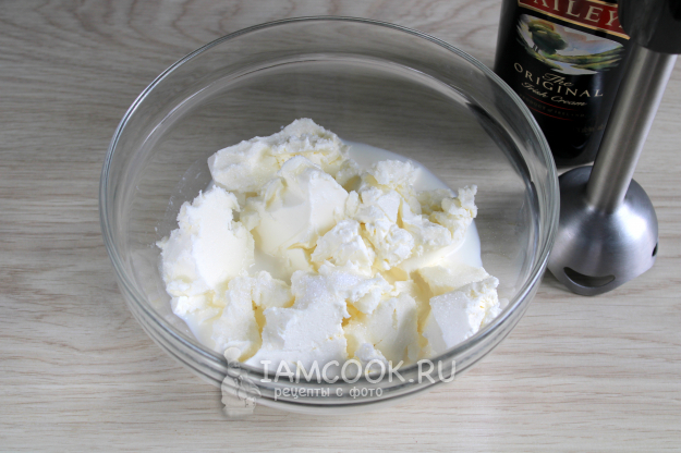 Для крема соедините творожный сыр, молоко и ликер Бейлис. Перемешайте до однородного состояния. Количество молока может варьироваться.
