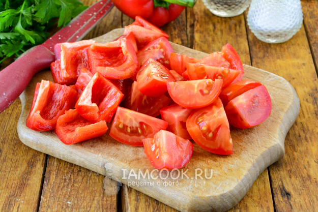 Почистите сладкий перец и нарежьте крупными кусочками. Таким же образом нарежьте плотные и мясистые помидоры.