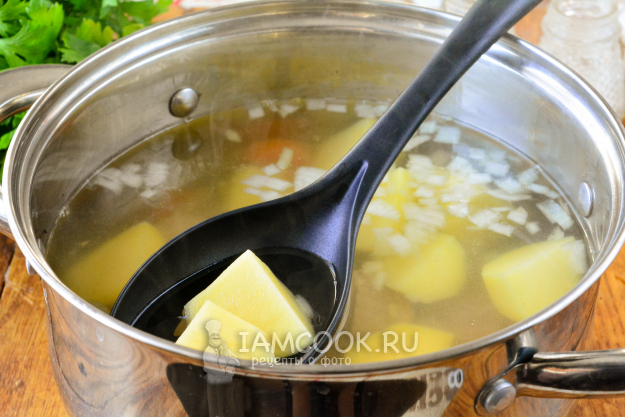 В бульон выложите картофель и варите вместе с мясом еще 15 минут, почти до готовности.