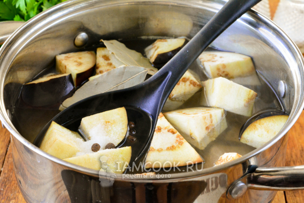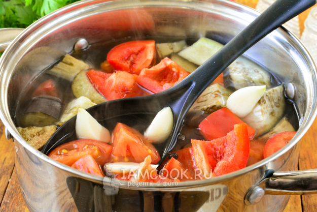 Затем выложите в кастрюлю все баклажаны, душистый перец горошком и лавровые листочки. На этом этапе посолите шурпу, так мясо останется максимально мягким и вкусным.