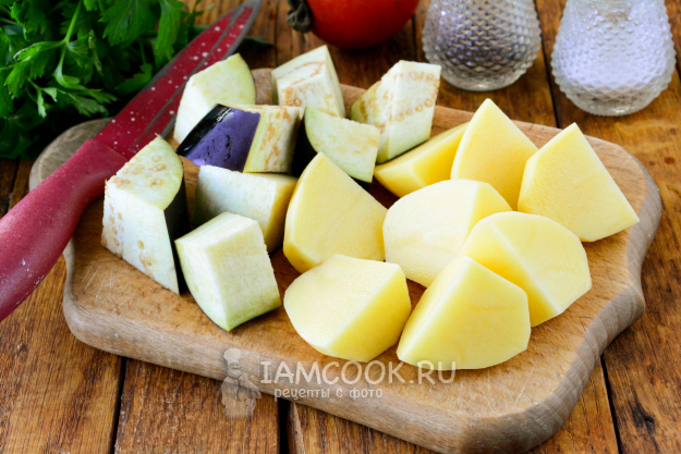 Почистите картофель, нарежьте его крупными кусочками. Срежьте хвостики с баклажанов и нарежьте аналогично - крупно.