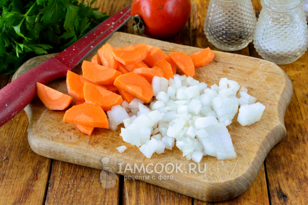 Почистите лук и морковь. Лук нарежьте мелкими кубиками, а морковь - полукольцами.