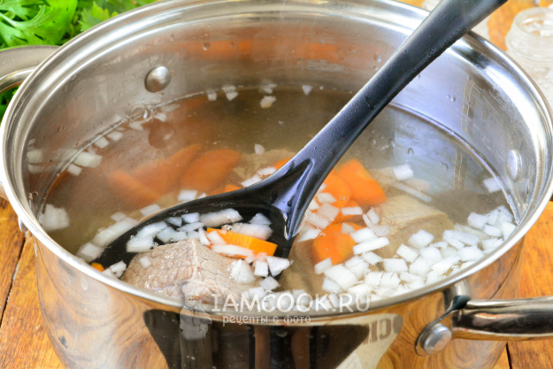 Когда мясо сварится, всыпьте в бульон лук и морковь, проварите овощи 5 минут.