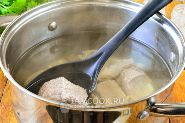 Говядину тщательно промойте, нарежьте крупными кусками и выложите в кастрюлю с холодной водой. Поставьте вариться на огонь. Когда вода закипит, убавьте мощность, снимите шум и варите бульон при медленном кипении 50-55 минут, до мягкости мяса.
