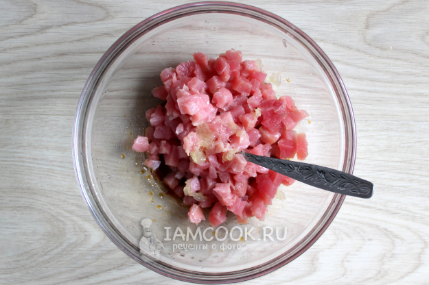 Размороженное филе тунца нарежьте мелким кубиком и поместите в маринад. Из половинки или из целого лимона выжмите сок, пусть даже немного его мякоти попадет на тунца. Перемешайте.