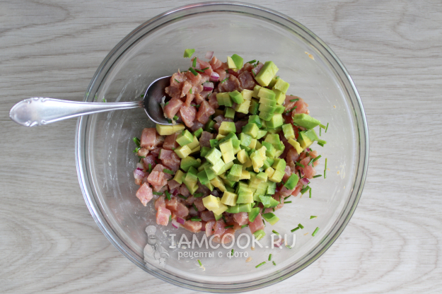 Тартар из тунца с кубиками авокадо есть смысл ещё сбрызнуть лимонным соком по вкусу.