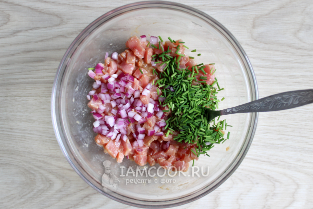 Ялтинский или другой не горький лук мелко нарежьте, шнитт-лук или зеленое перо лука мелко нашинкуйте и добавьте в тартар. Пусть все ингредиенты пропитаются между собой минут 10.
