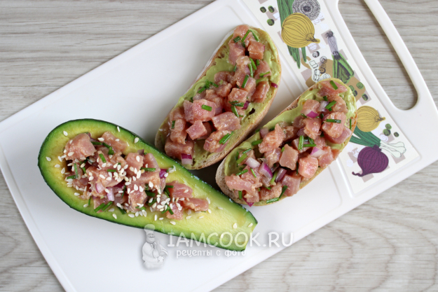 Одну половинку оставьте с кожурой, а в углубление уложите тартар в количестве 2,5-3 ст.л., посыпьте кунжутом. Ломтики чиабатты или другого белого хлеба по желанию подсушите на сковороде.