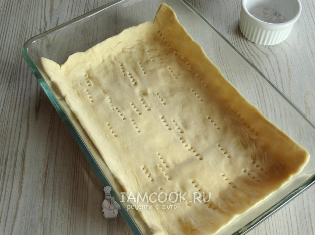 Тесто немного раскатать выложить в подходящую форму, наколоть вилкой.
