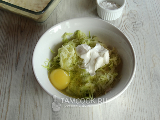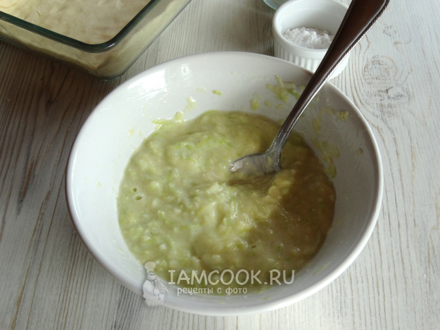Кабачок натереть на мелкой тёрке, отжать. Так же натереть и чеснок.