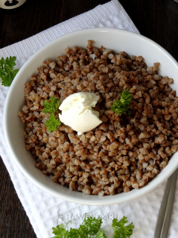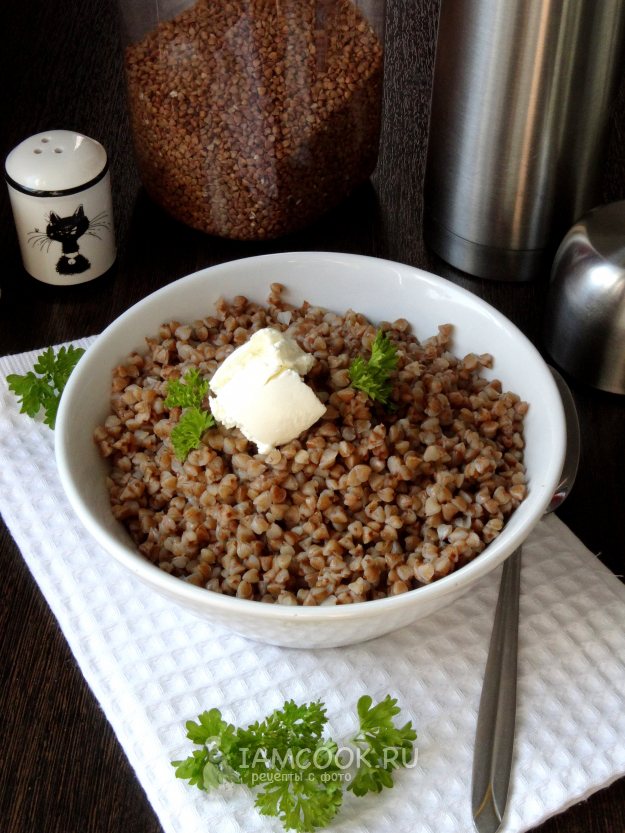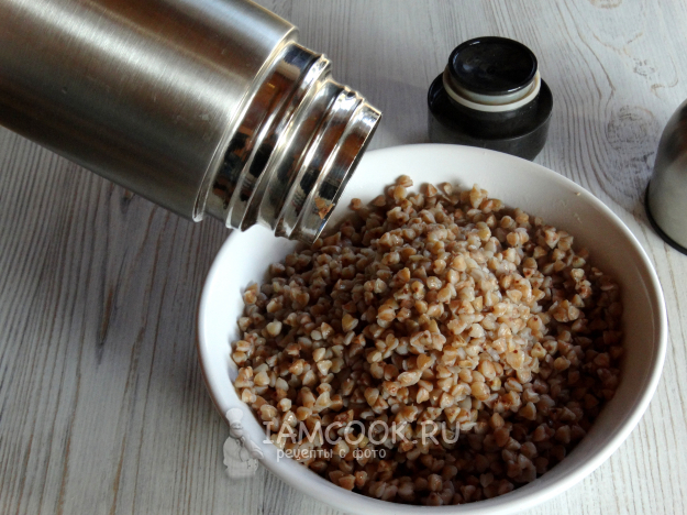 Гречка в термосе, можно сказать, "запаривается" постепенно и равномерно. Она вытряхивается из "сосуда" легко и без остатка, затем остаётся только посолить и сдобрить сливочным маслом по вкусу.