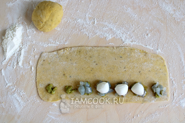 В зависимости от нужного количества фарша порубите креветки вручную или при помощи кухонной техники. Порции теста для равиолей на присыпанной мукой доске тонко раскатайте в удлиненную прямоугольную заготовку так, чтобы на одну сторону теста выкладывать начинку, а второй - закрыть эту начинку. Состав начинки: соус песто – около 1/4 ч.л. или по вкусу, около 1 ч.л. рубленых креветок и треть маленького шарика моцареллы.