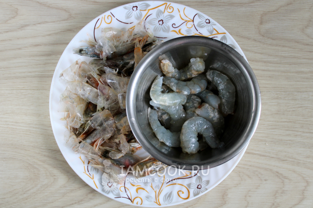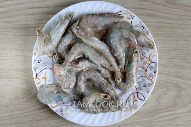 Креветки желательно взять замороженные сырые, т.е. невареные – серые, но можно и вареные замороженные – розовые/оранжевые. Масса указана неочищенных.