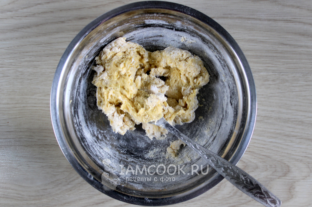 Добавьте муку и перемешайте вилкой или лопаткой, чтобы ингредиенты схватились.