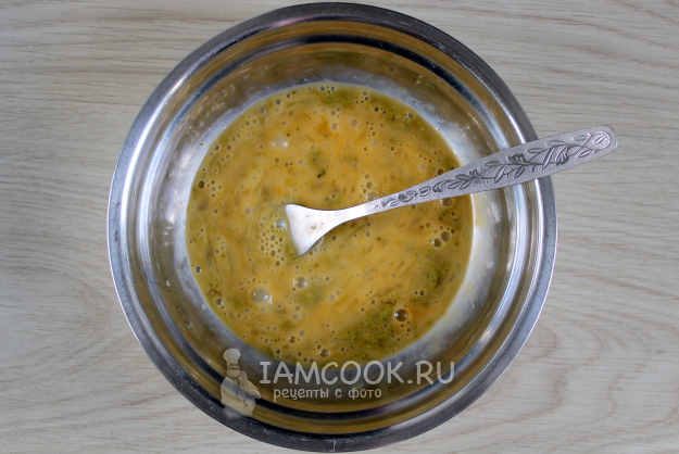 Для теста размешайте яйцо среднего размера с порцией соуса песто.