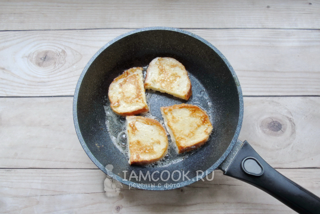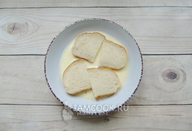 Ломтики батона разрежьте на две части и окуните в приготовленную смесь.
