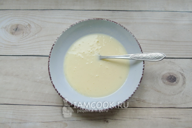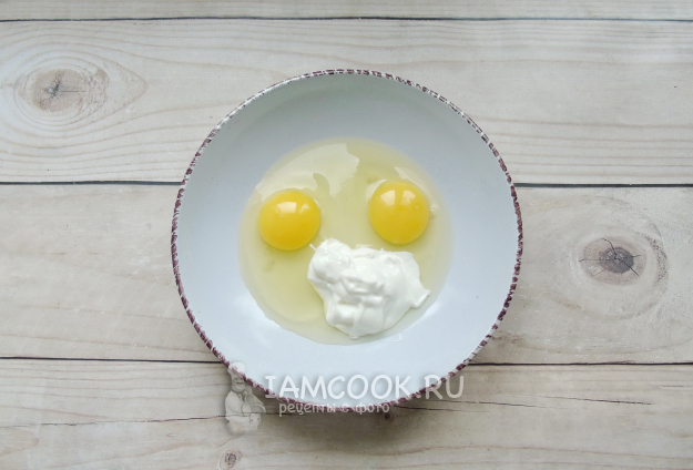 Если нужно, немного посолите и перемешайте яйца и сметану вилкой или венчиком. Я обычно не солю, но это дело вкуса.