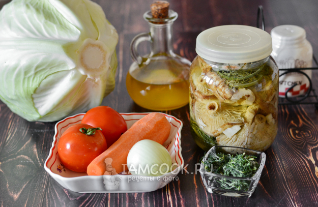 Нехитрый набор продуктов для приготовления солянки с груздями и капустой соберите по списку.