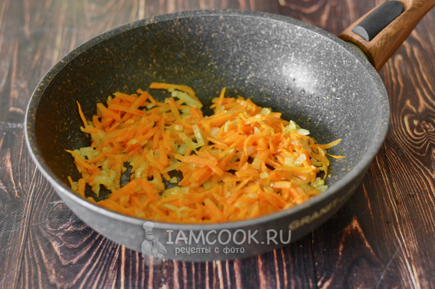 Начинаем готовить солянку. Разогрейте в сковороде растительное масло. Очистите лук и морковь. Лук нарежьте мелко, а морковь натрите на крупной тёрке. Обжарьте их на среднем огне до золотистого цвета.