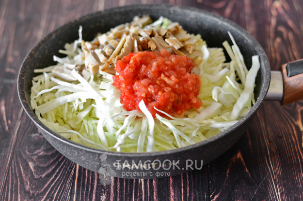 Нашинкуйте соломкой капусту. Подготовленные грузди (см.выше) нарежьте крупной соломкой, а помидоры мелко нарубите.