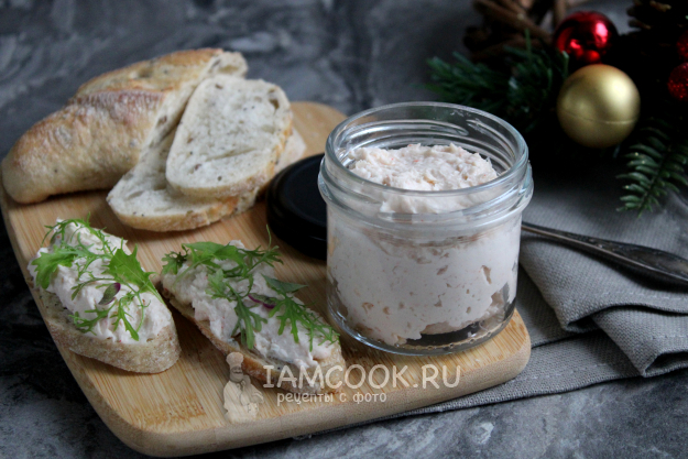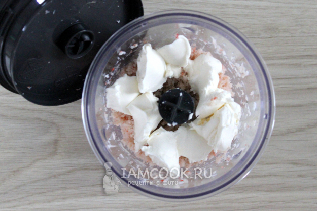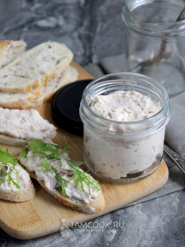 Осталось добавить творожный сыр, равномерно перемешать его с креветочной массой, и паштет готов.