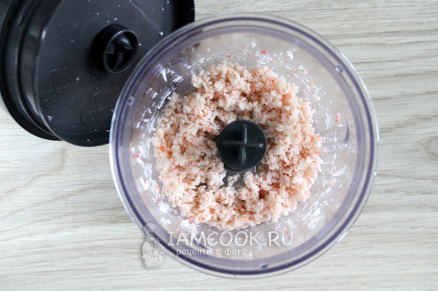 Затем нужно измельчить креветки в чаше блендера.