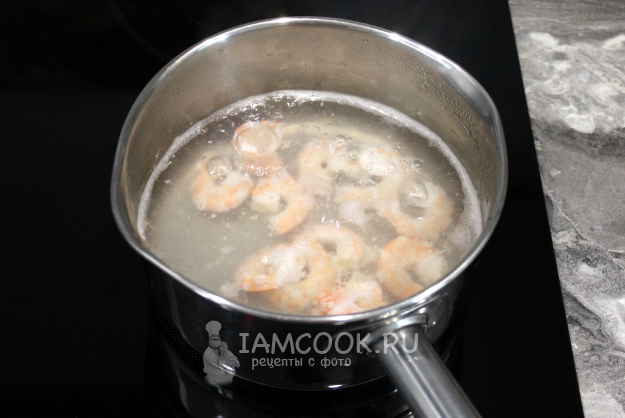 Очистите и сварите креветки.