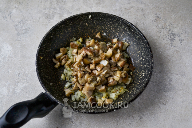 У меня вареные замороженные белые грибы. Если у вас тоже замороженные грибы, то полностью их разморозьте и мелко нарежьте. Положите грибы к луку. Помешивая, обжарьте грибы с луком 5-6 минут.