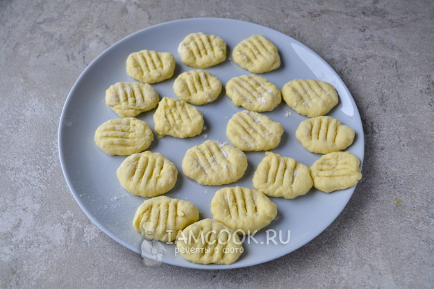 Отщипните кусочек теста, сформуйте из него небольшие клецки овальной формы. Вилкой сделайте характерные полоски на поверхности клецек. Чтобы вилка не прилипала к поверхности ньокки, каждый раз обмакивайте вилку в муку.