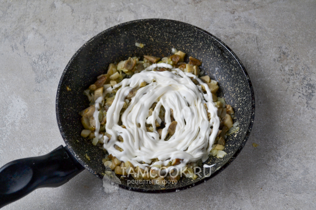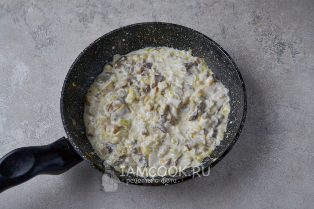 Перемешайте, потушите грибы с луком в сливках 5-6 минут.