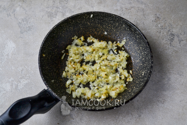Для соуса мелко нарежьте лук, обжарьте его на растительном масле до легкого золотистого цвета.