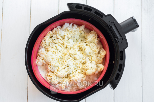 Заполненную форму установим в чашу аэрогриля и загрузим в сам аэрогриль. Будем запекать цветную капусту в аэрогриле в течение 20 минут при температуре 180 градусов.