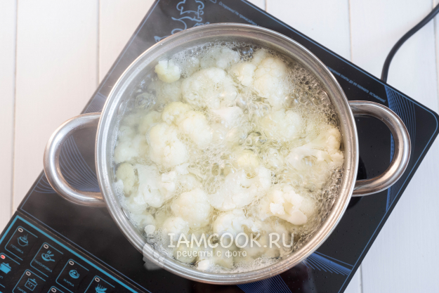 Будем варить в кастрюльке с водой соцветия цветной капусты 5-8 минут с момента закипания жидкости.